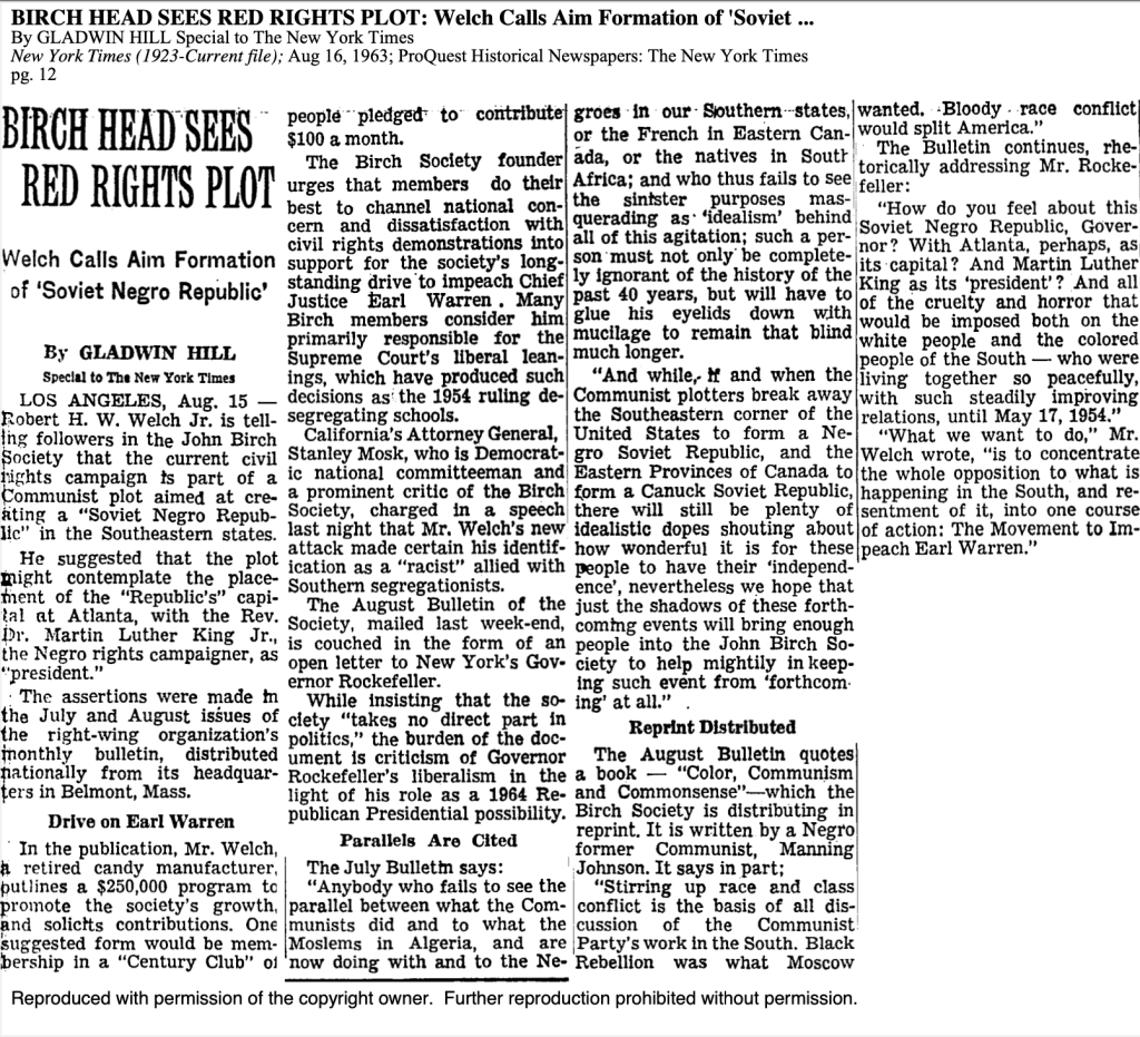 African-Americans needed to be denied the right to vote (among other liberties) because they were going to carve out a separate nation with MLK as their president. While that forecast was obviously pretty far off base, the article below from the New York Times was published a full decade before I was born into my JBS household. But my parents joined the Birch Society in 1960 or 1961, I believe. That means they have been stewing in this type of thought for 60+ years.
